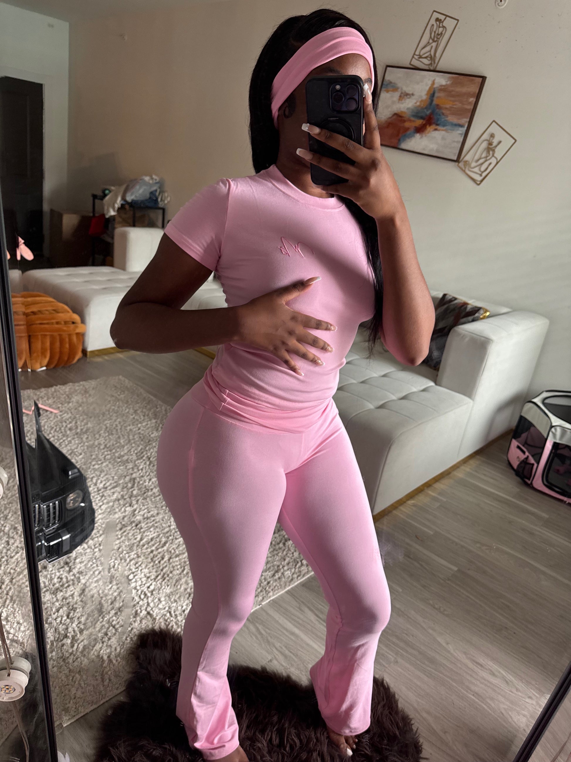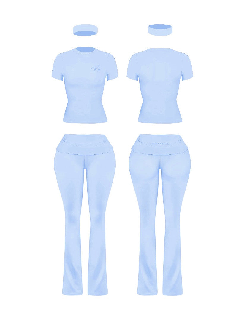 Elevate your activewear collection with this stylish and functional three-piece set, featuring a matching top, flare pants, and coordinating headband. Crafted from a soft, stretchy fabric, this ensemble offers a comfortable fit that moves with you, making it perfect for workouts, yoga sessions, or casual outings. The set is true to size and available in vibrant shades of pink, blue, and yellow, allowing you to express your personal style while staying active.
