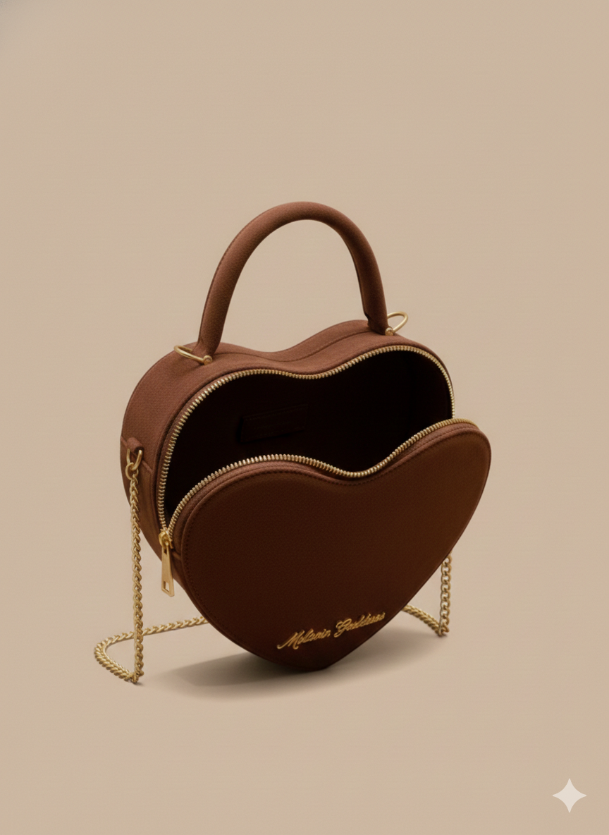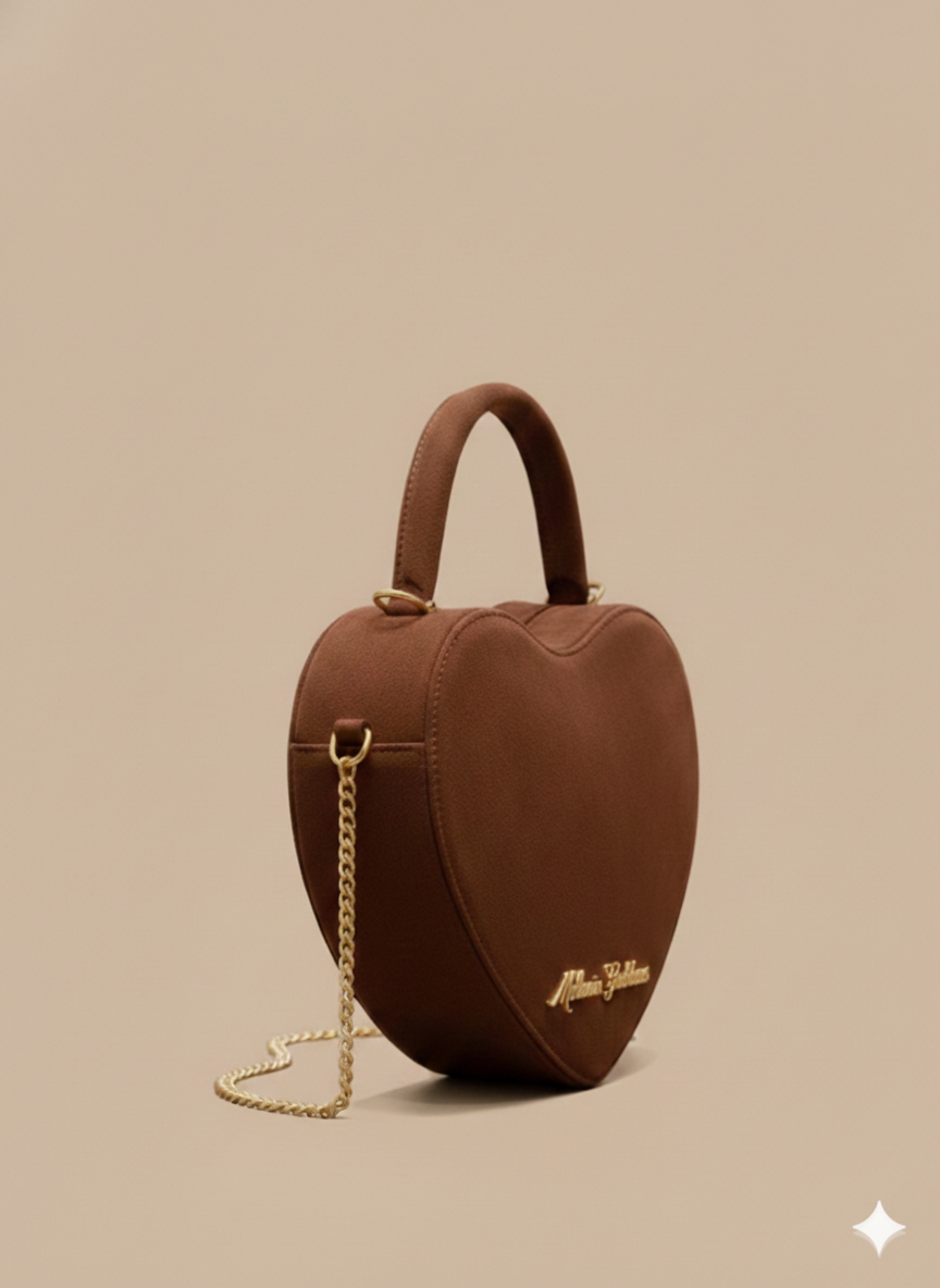 Fall in love with the perfect blend of whimsical charm and high-end sophistication. Crafted in a rich, chocolate-toned plush velvet, this heart-shaped silhouette is designed to be the centerpiece of your collection. Featuring our signature "mg" gold cursive hardware and a delicate gold chain, it transitions seamlessly from a chic top-handle to an elegant crossbody.